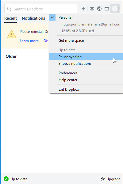 O ícone do Dropbox na barra de notificações vai mudar se a sincronização for interrompida.