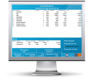 Impressão de relatórios e resumo para enviar à contabilidade com resumo das vendas efetuadas contendo documento, número, taxa iva, iva e total. Separação entre produtos e serviços.